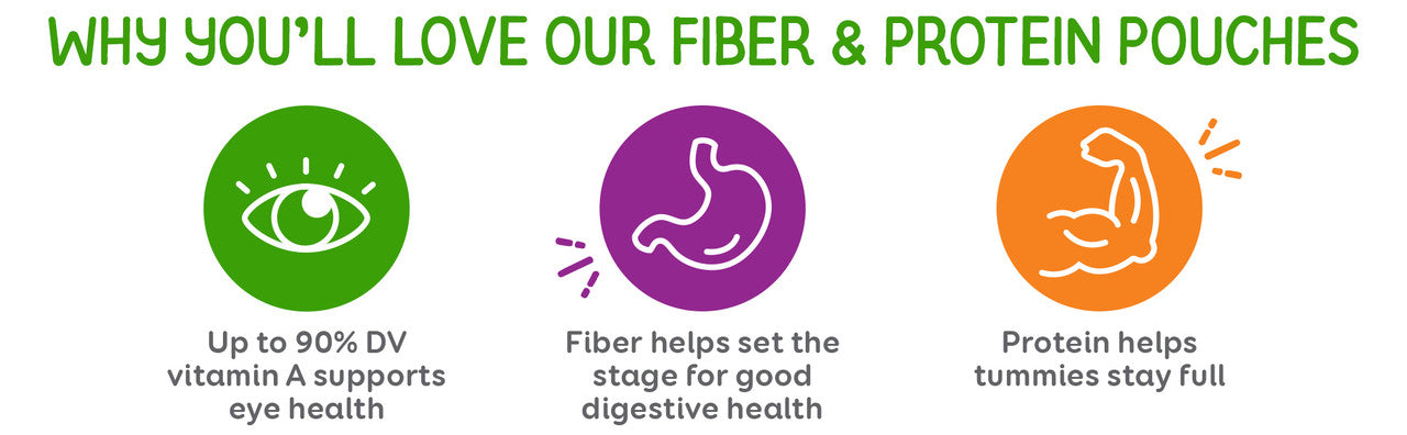 This scrumptious combination of organic apple, peach, pumpkin and cinnamon is fortified with the nutrients your toddler needsprotein for growth and fiber to support digestive health.Especially good for picky eaters, our Fiber & Protein pouches are a delicious mix of organic fruits and veggies that we optimize with the added nutrients energetic toddlers need protein for their growing bodies and fiber to support digestive health.
